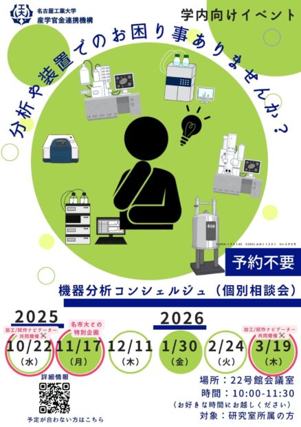産学官金連携機構設備共用部門では教員、学生を対象とした『機器分析コンシェルジュ~どの装置でどうやって分析すればいいの? 教えて!~』を開催します。