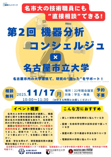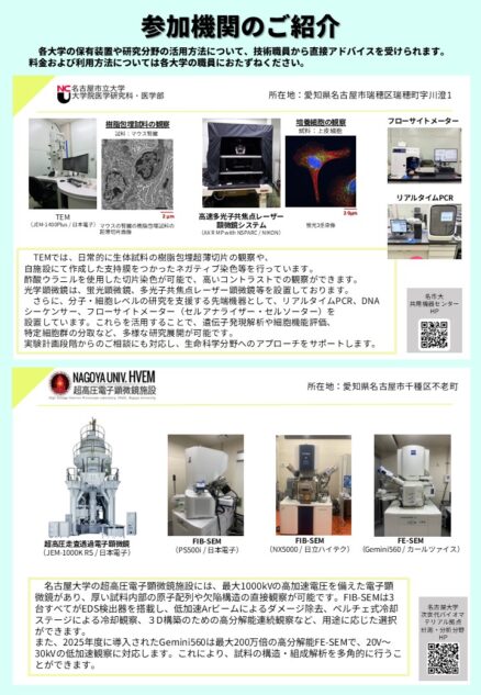 医療・生命科学分野に強い名古屋市立大学の技術職員が相談員として参加します。また名古屋大学 超高圧電子顕微鏡施設の職員も相談員として参加します。